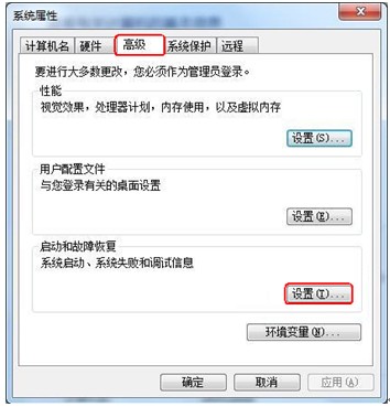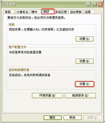 鼠标右键单击“我的电脑”图标,在弹出菜单中选属性栏,出现“系统属性”对话框,在该对话框中点击“高级”选项卡,在“高级”选项卡中,点击 “启动和故障恢复”中的“设置”按钮,也就是在当前对话框上,从上向下数起的第三个“设置”按钮。(注意:如果您没有看到“高级”选项卡,请一定再次确认您登陆机器的账户是管理员或者属于管理员组)。