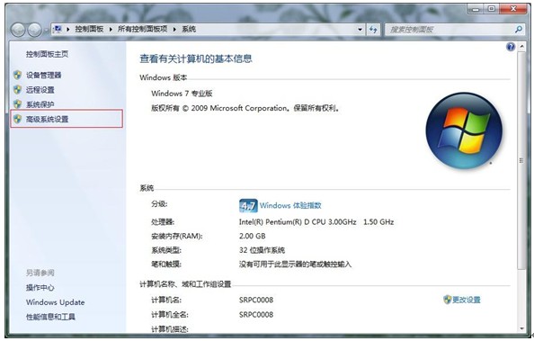 鼠标右键单击“我的电脑”图标,在弹出菜单中选属性栏,出现如下下图所示对话框界面。选择“高级系统设置按钮”(如果系统询问是否继续,请点击“允许” 按钮)。