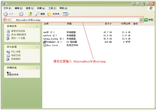 Step1. 打开 “我的电脑”,并在地址栏中输入 “%SystemRoot%\Minidump”(不要带双引号)